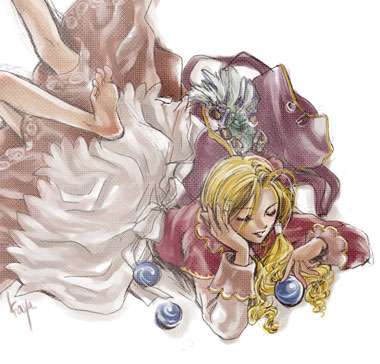 Ro内での所属ギルドのお絵描きしりとり企画に投稿したもの。「クリスタルブルー」がお題でした。マチャ子が持ってる青い球ですね。